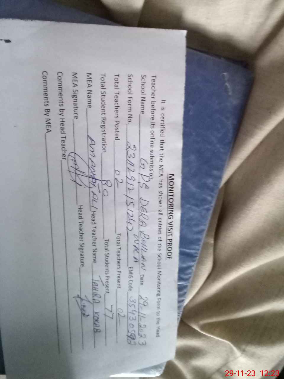 | Attendance Register | Head Teacher | MEA with School | Visit Proof |