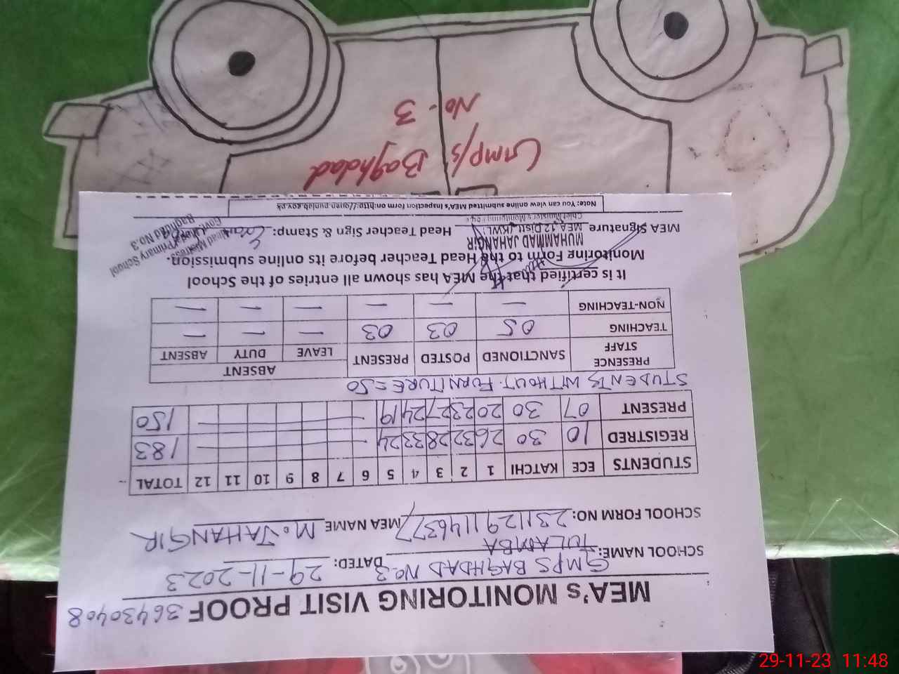 | Attendance Register | Head Teacher | MEA with School | Visit Proof |