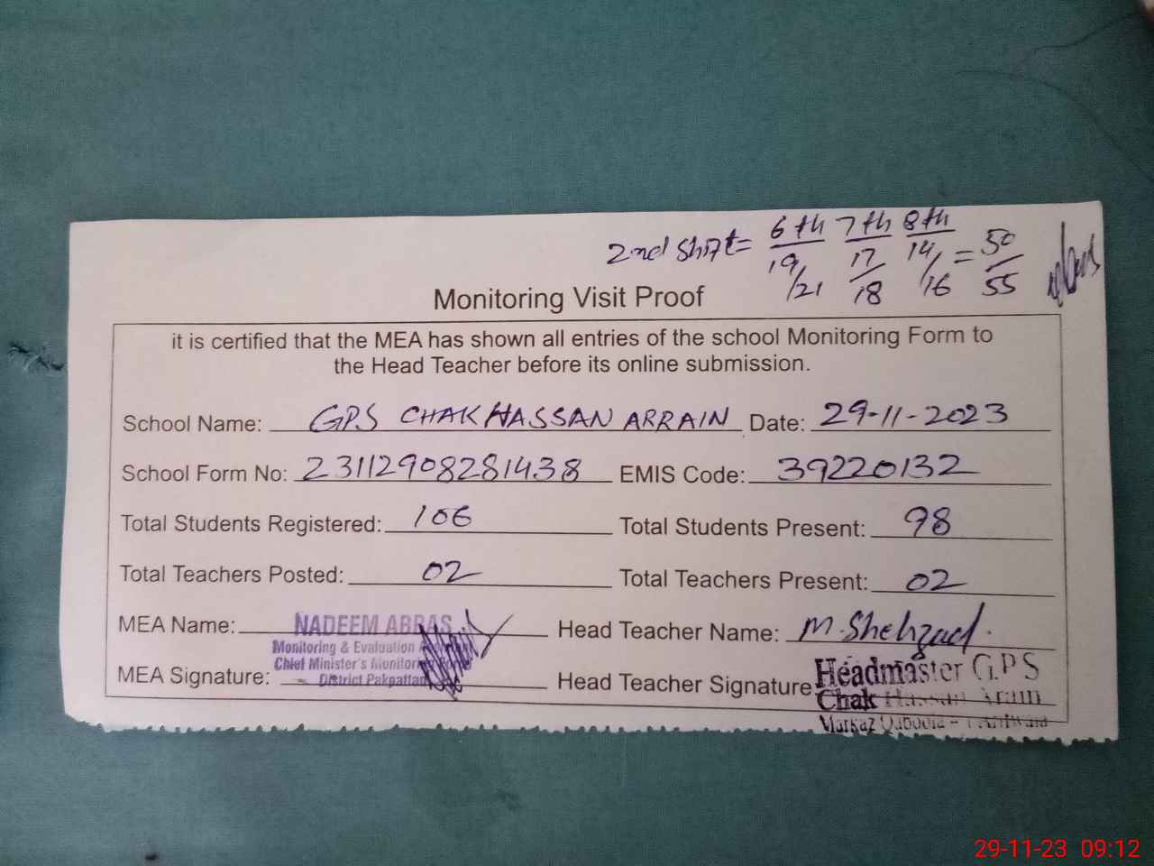 | EMIS Code: 39220132 | Name of School: GPS CHAK HASSAN ARRAIN | |||