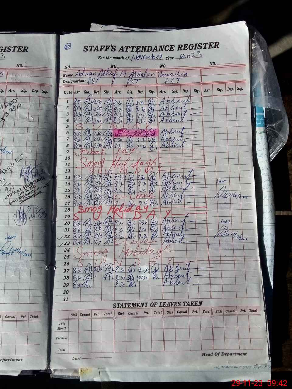 | CNIC | Full Name | Designation | R/C | Absence During Last Calender Month |