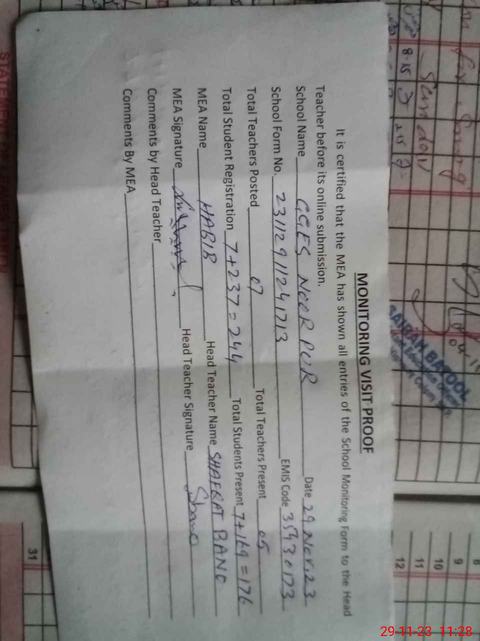 | Attendance Register | Head Teacher | MEA with School | Visit Proof |