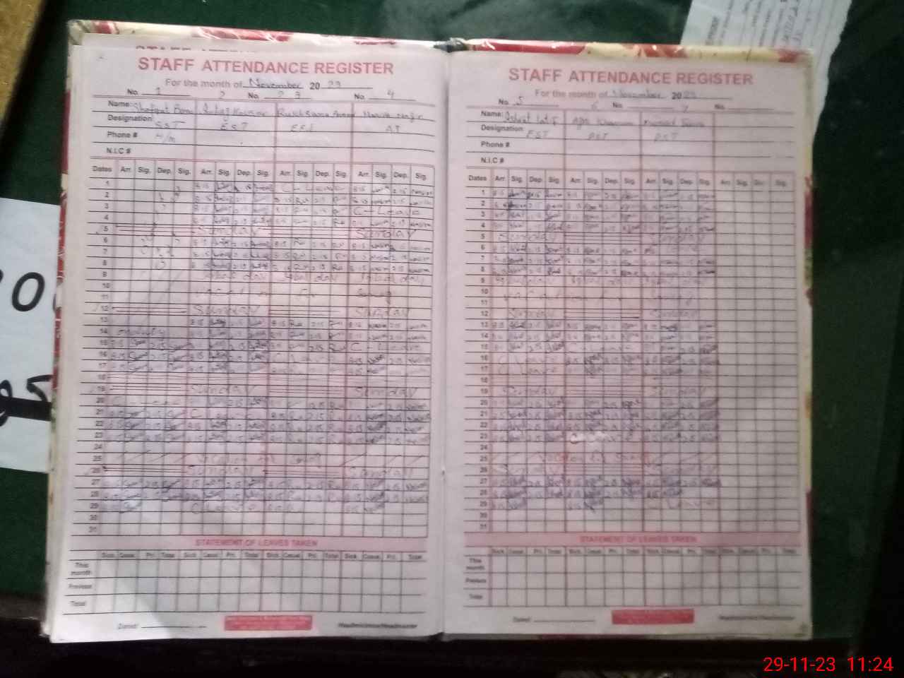 | CNIC | Full Name | Designation | R/C | Absence During Last Calender Month |