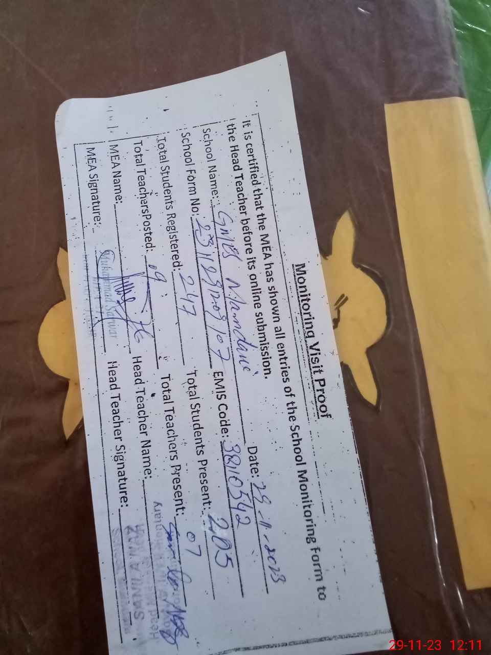 | Attendance Register | Head Teacher | MEA with School | Visit Proof |