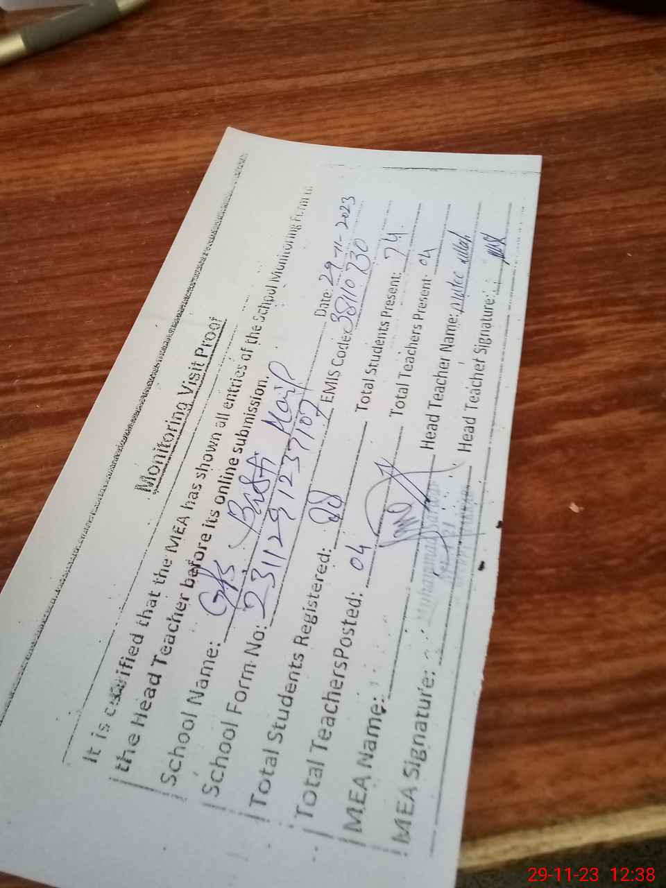 | Attendance Register | Head Teacher | MEA with School | Visit Proof |