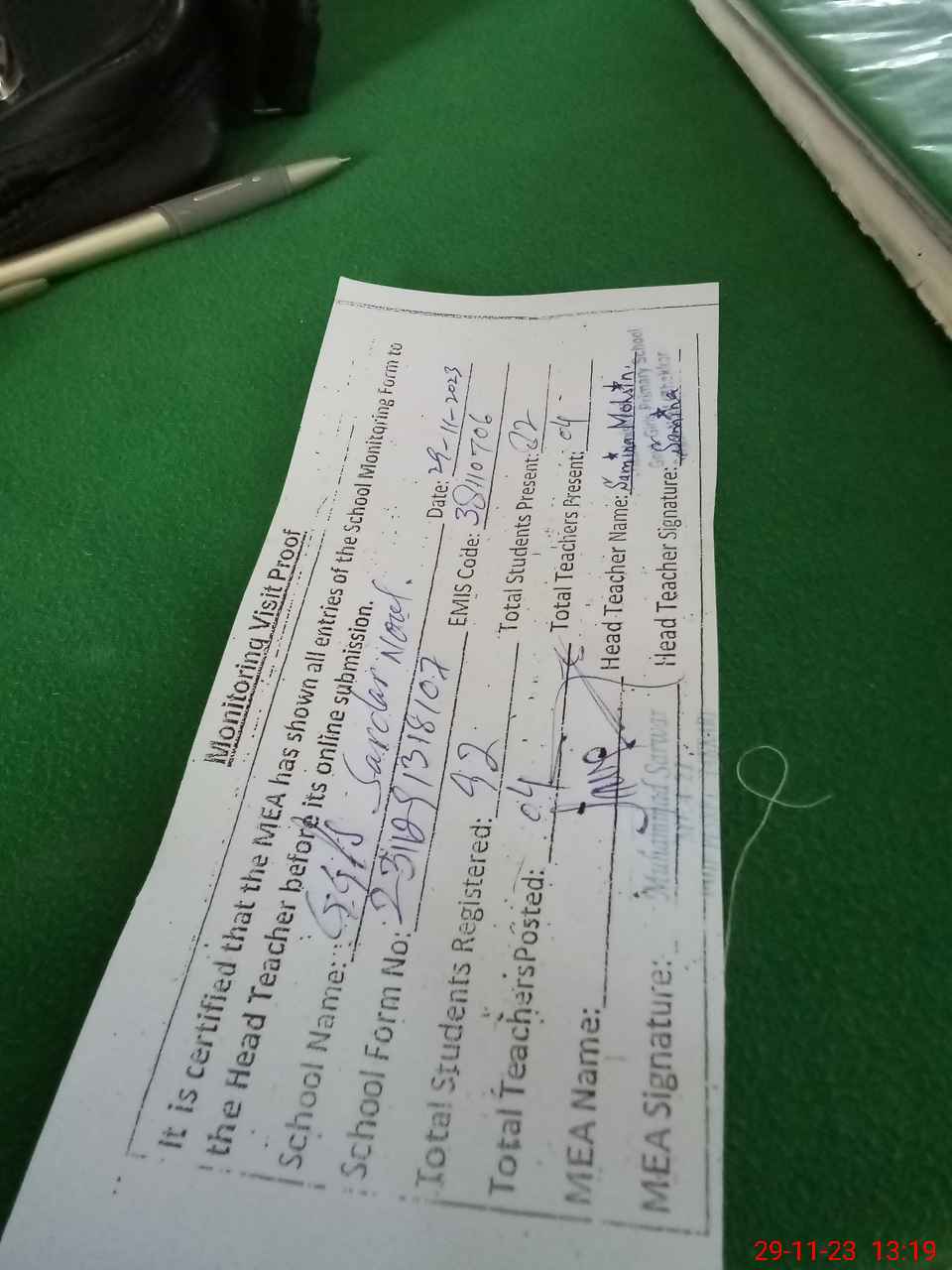 | Attendance Register | Head Teacher | MEA with School | Visit Proof |