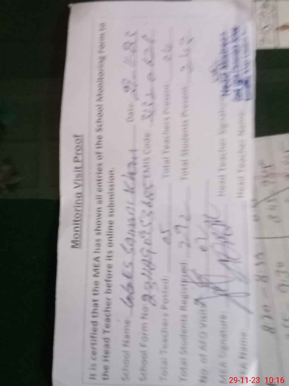 | Attendance Register | Head Teacher | MEA with School | Visit Proof |