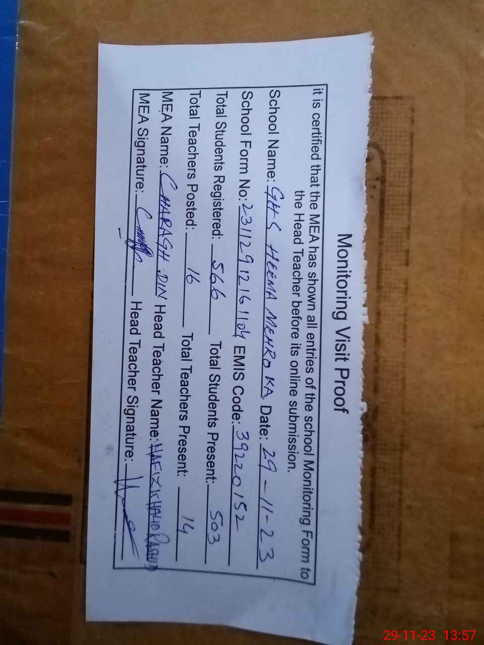 | Attendance Register | Head Teacher | MEA with School | Visit Proof |