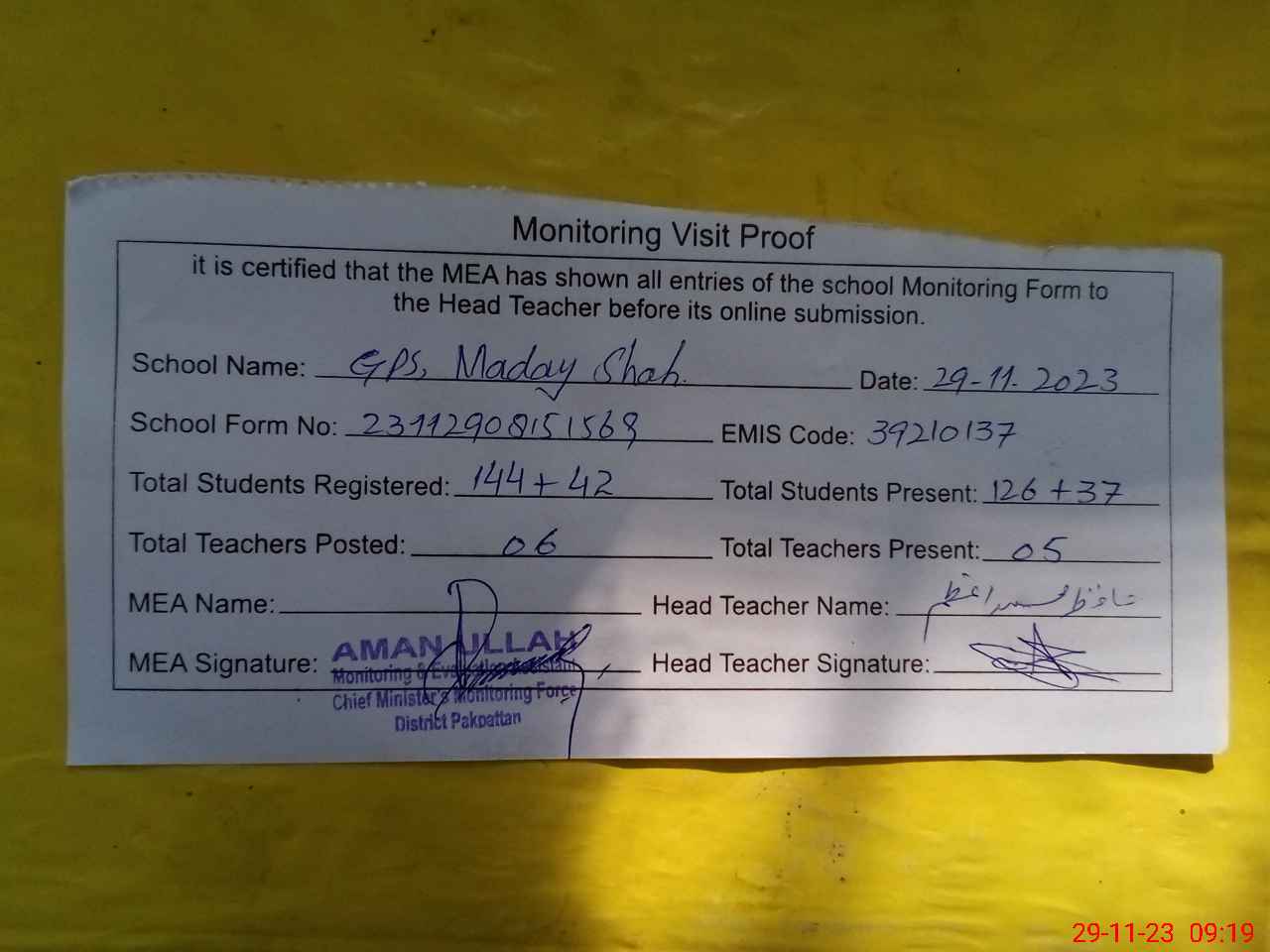 | EMIS Code: 39210137 | Name of School: GPS MADAY SHAH | |||