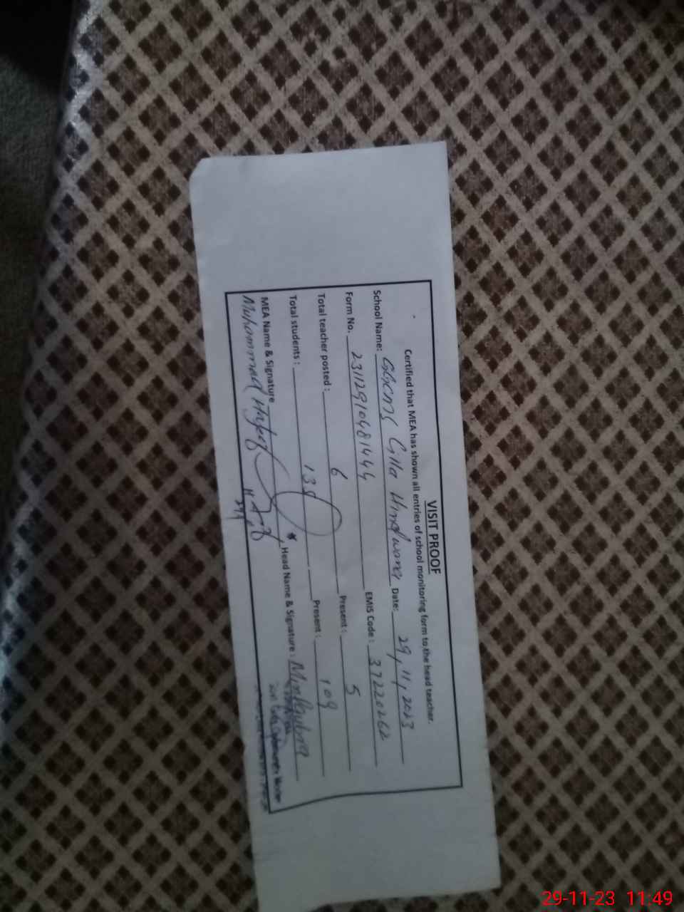 | Attendance Register | Head Teacher | MEA with School | Visit Proof |