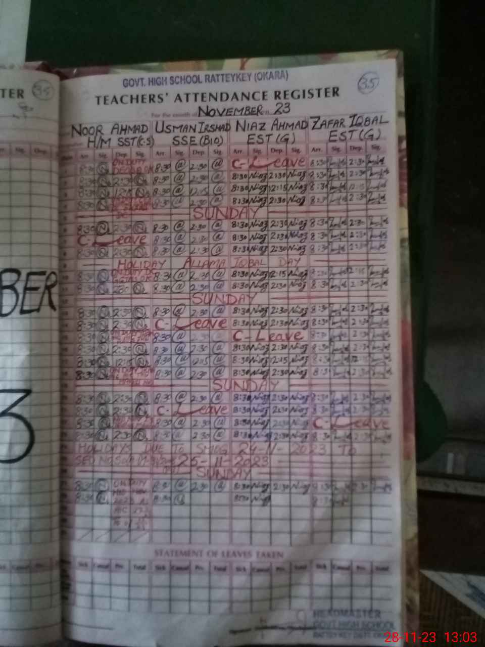 | CNIC | Full Name | Designation | R/C | Absence During Last Calender Month |