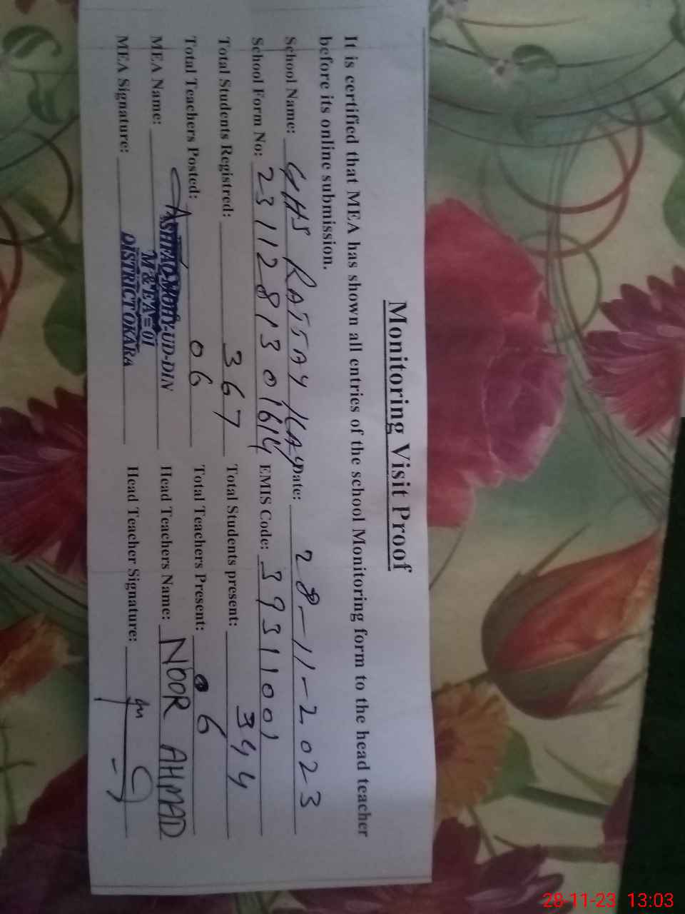 | Attendance Register | Head Teacher | MEA with School | Visit Proof |