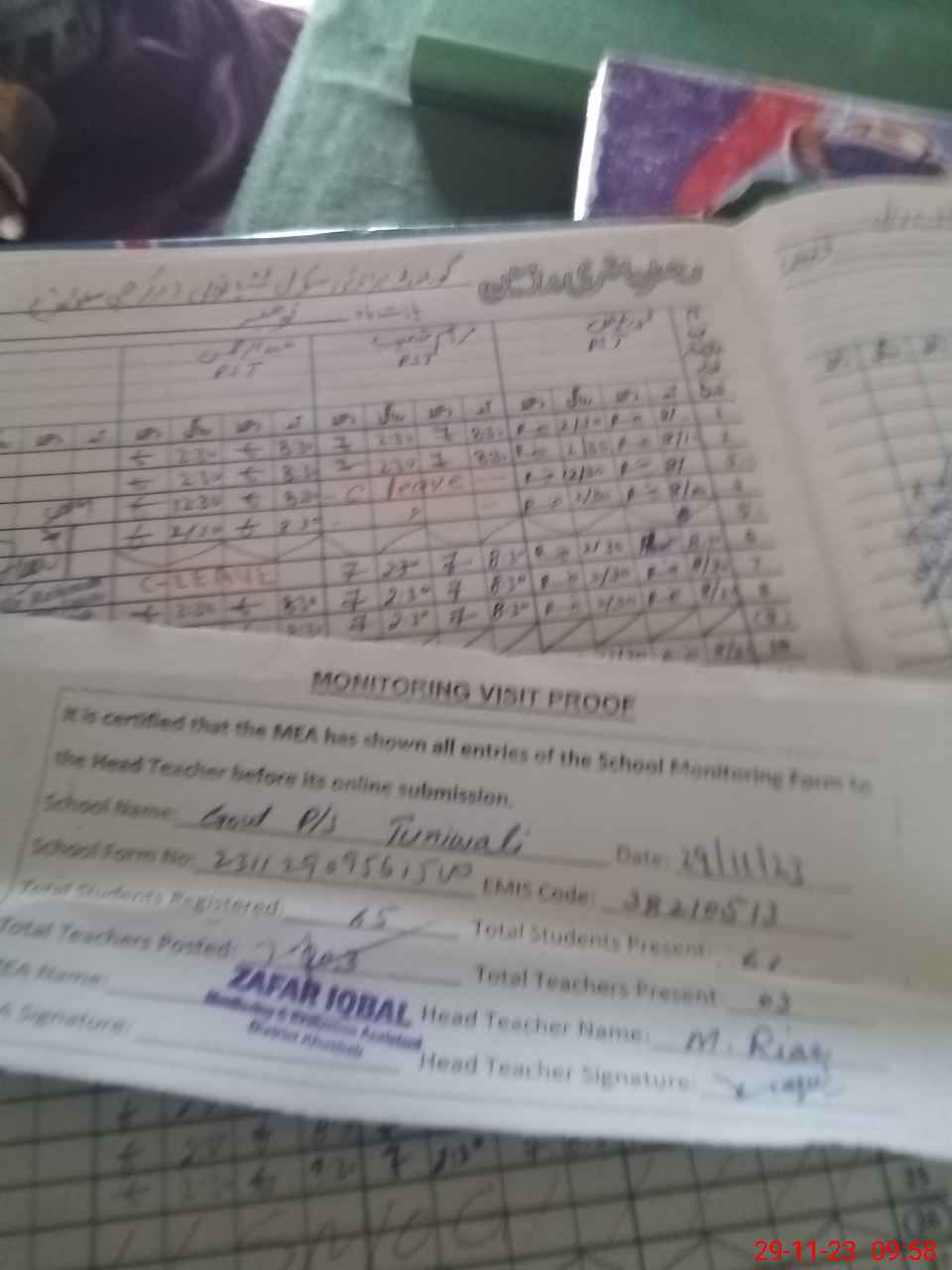 | Attendance Register | Head Teacher | MEA with School | Visit Proof |