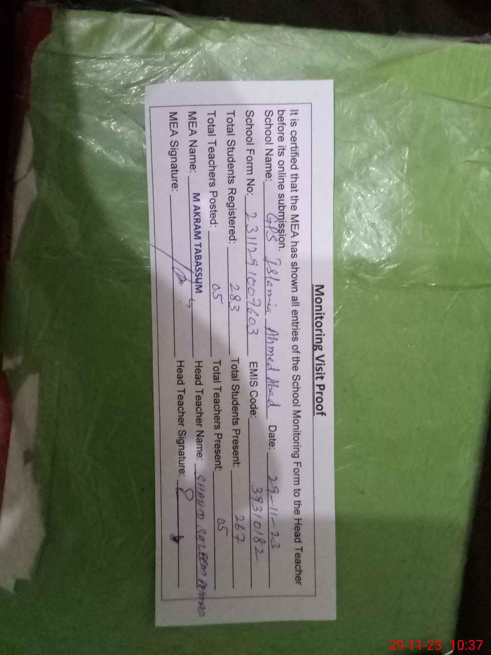 | Attendance Register | Head Teacher | MEA with School | Visit Proof |