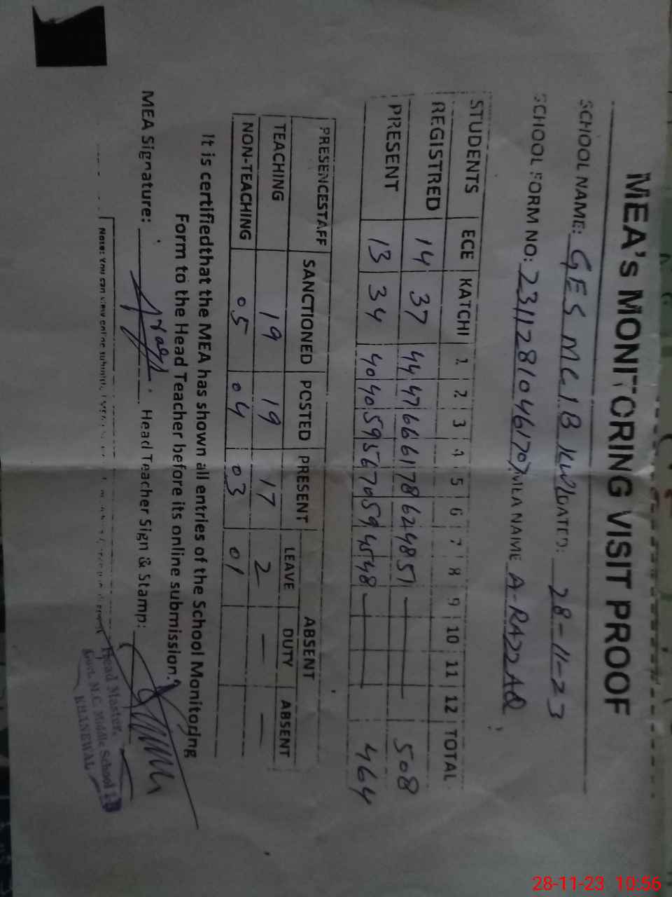 | Attendance Register | Head Teacher | MEA with School | Visit Proof |
