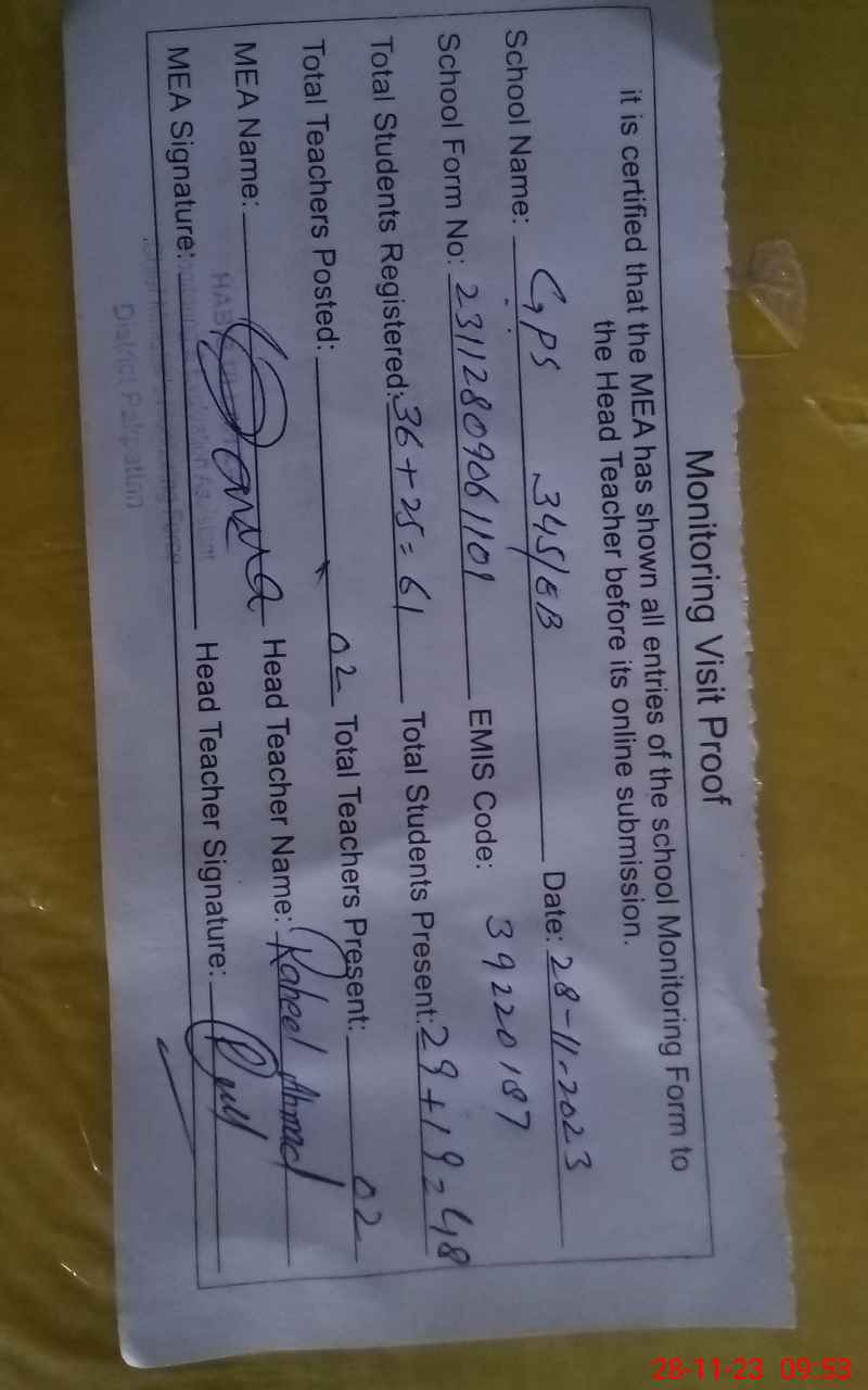 | EMIS Code: 39220187 | Name of School: GPS 345 EB ARIFWALA | |||
