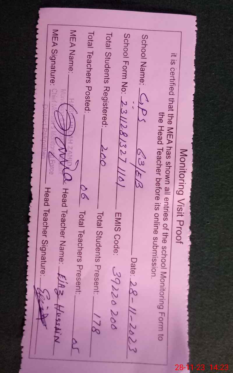 | Attendance Register | Head Teacher | MEA with School | Visit Proof |