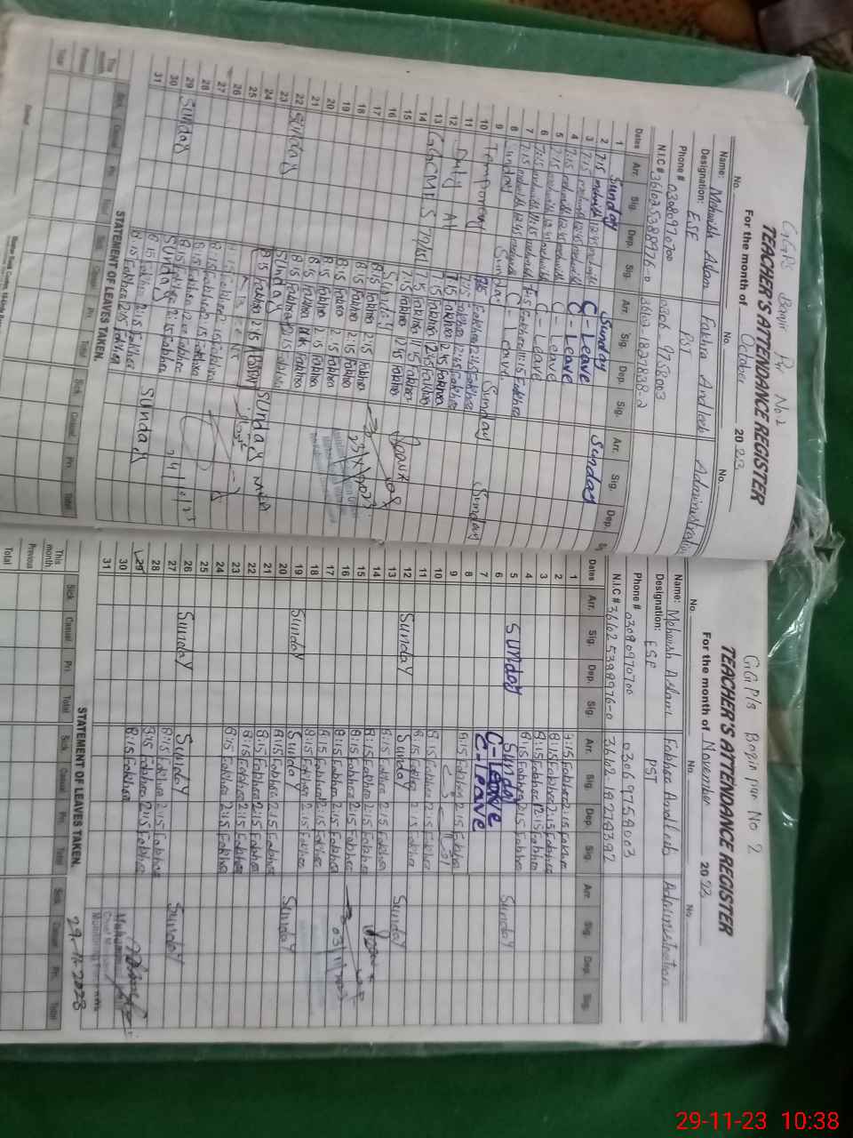 | Remarks (Use Separate Page if Required): ESE Mehwish Aslam absent NSB record register not updated from September to October 2023 and bank account statement also not available Lesson plan for littnum not available | |||||