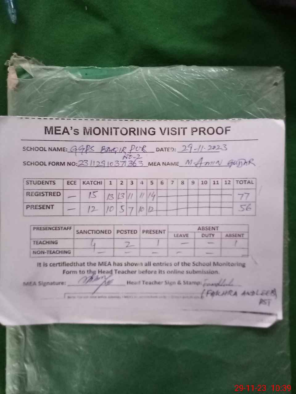 | Attendance Register | Head Teacher | MEA with School | Visit Proof |
