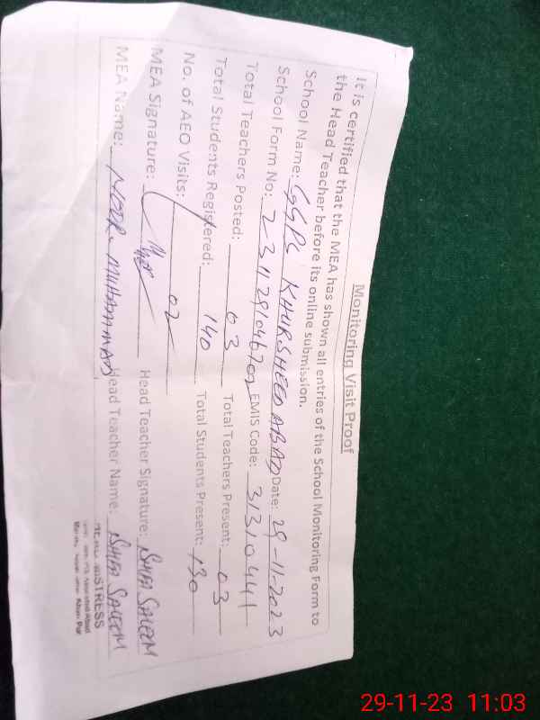 | EMIS Code: 31310441 | Name of School: GGPS KURSHEED ABAD | |||