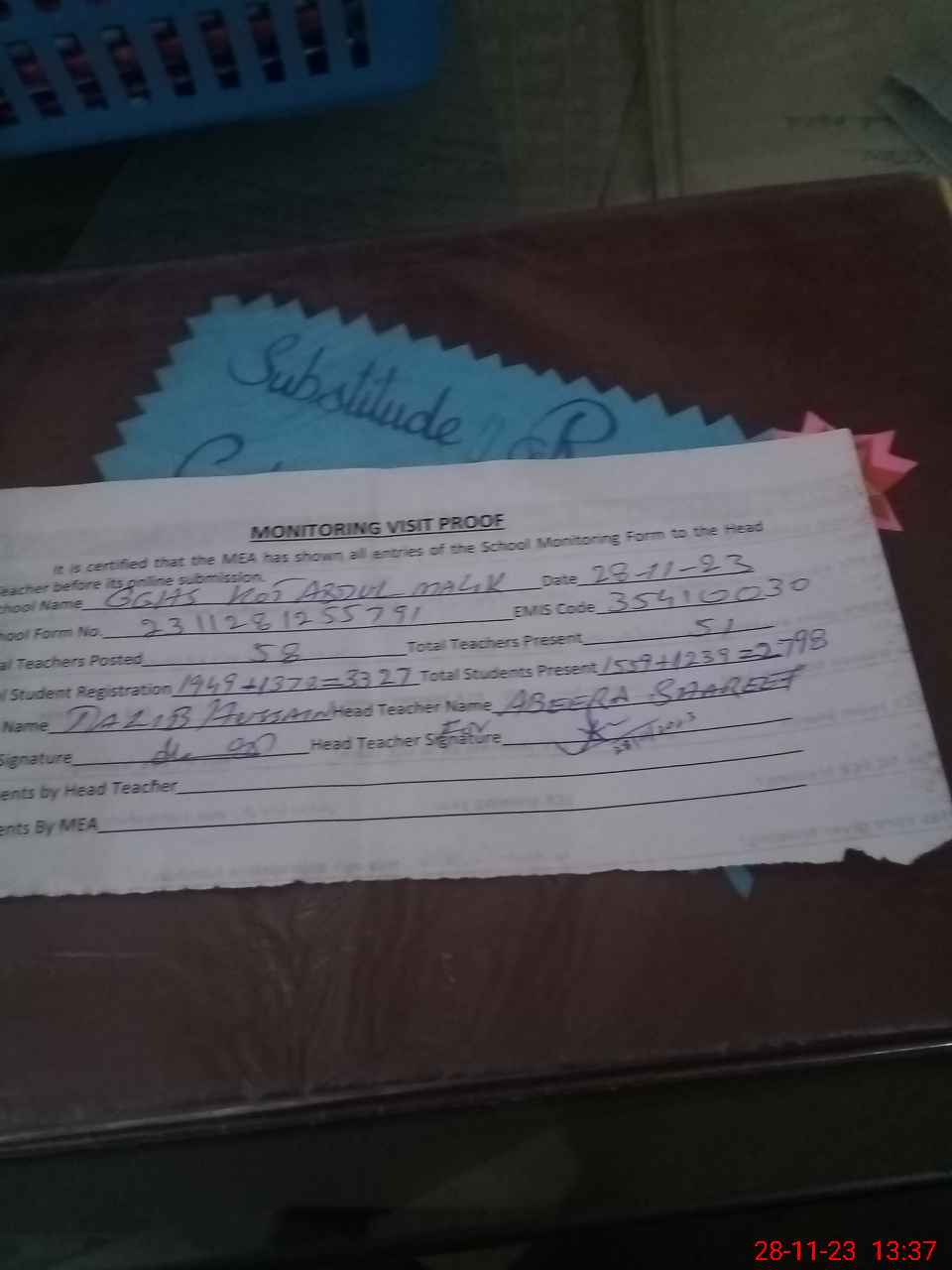 | Attendance Register | Head Teacher | MEA with School | Visit Proof |