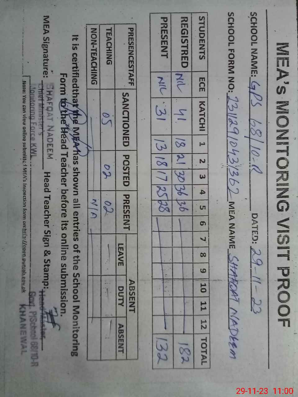 | EMIS Code: 36420167 | Name of School: GPS 68/10-R, P/O 70/10-R, KHANEWAL | |||