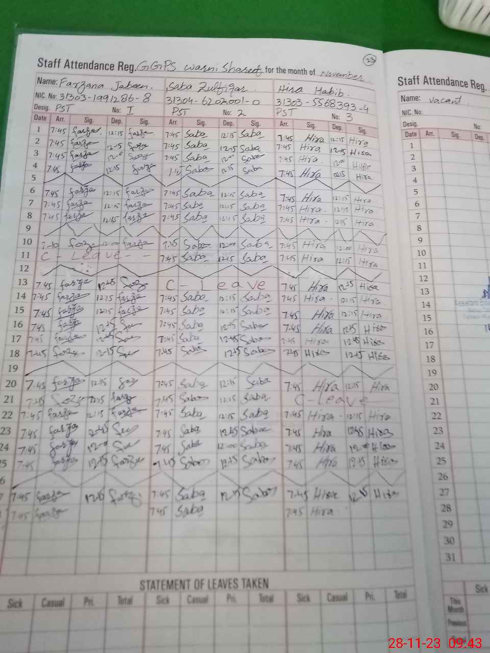 | CNIC | Full Name | Designation | R/C | Absence During Last Calender Month |