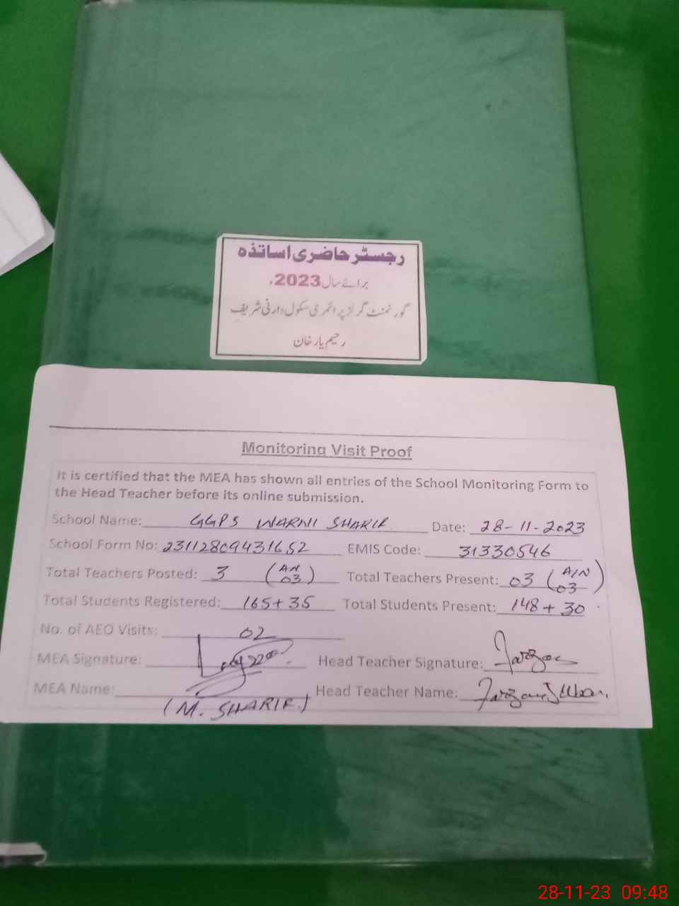 | Attendance Register | Head Teacher | MEA with School | Visit Proof |