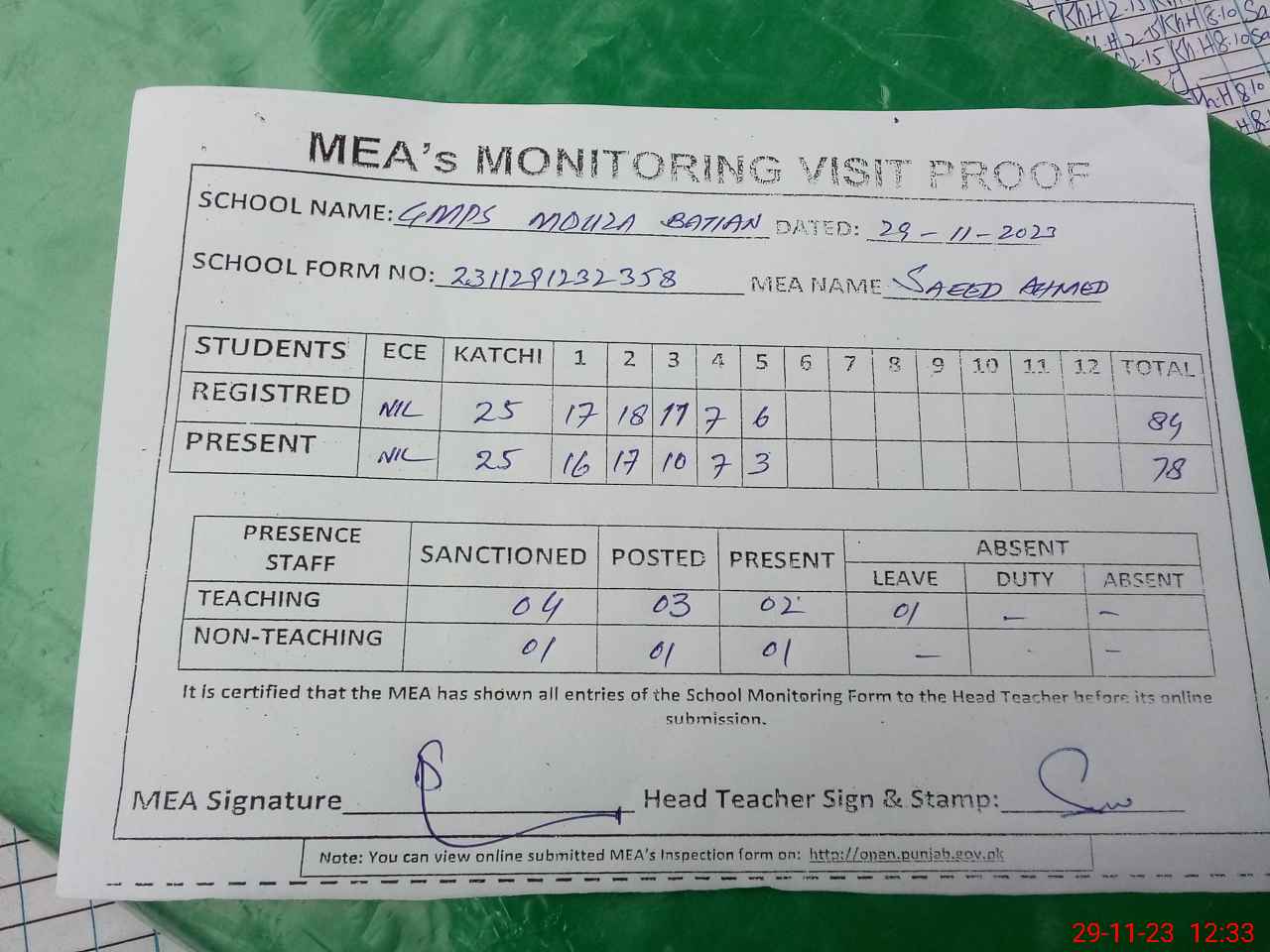 | Attendance Register | Head Teacher | MEA with School | Visit Proof |
