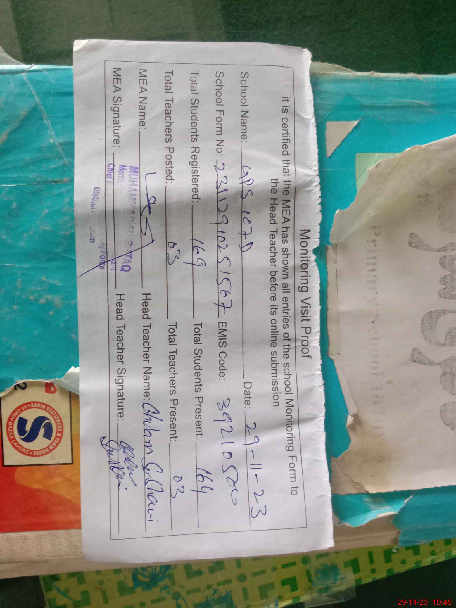 | Attendance Register | Head Teacher | MEA with School | Visit Proof |