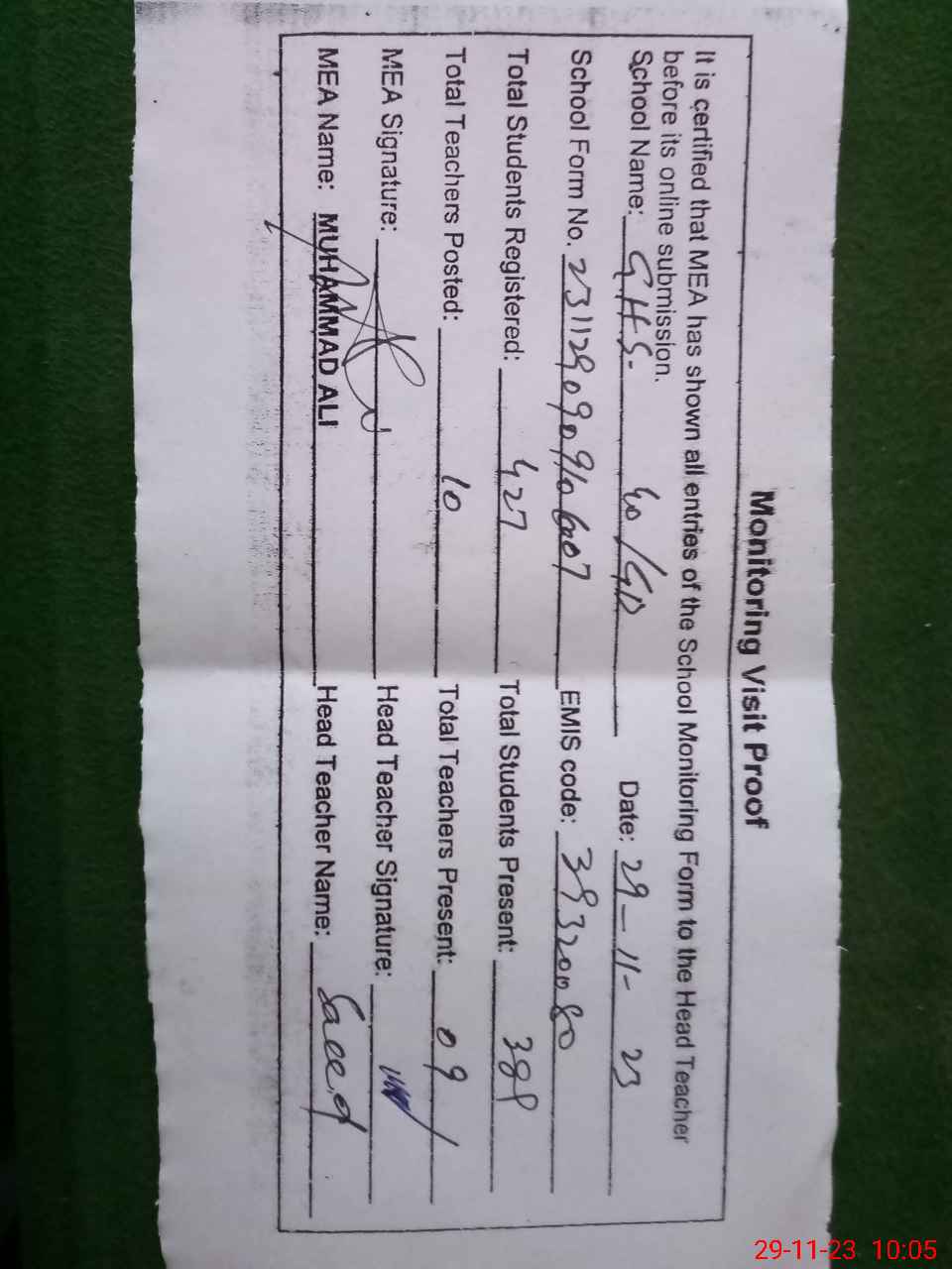 | Attendance Register | Head Teacher | MEA with School | Visit Proof |