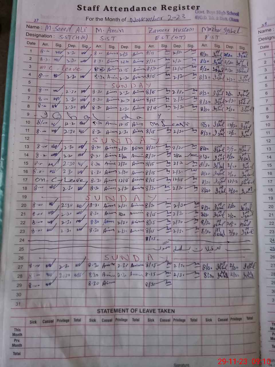 | CNIC | Full Name | Designation | R/C | Absence During Last Calender Month |
