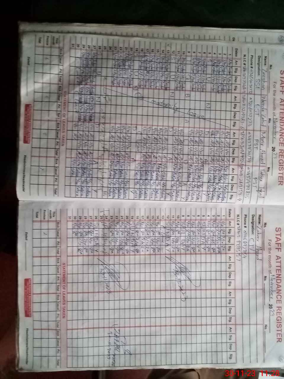 | CNIC | Full Name | Designation | R/C | Absence During Last Calender Month |