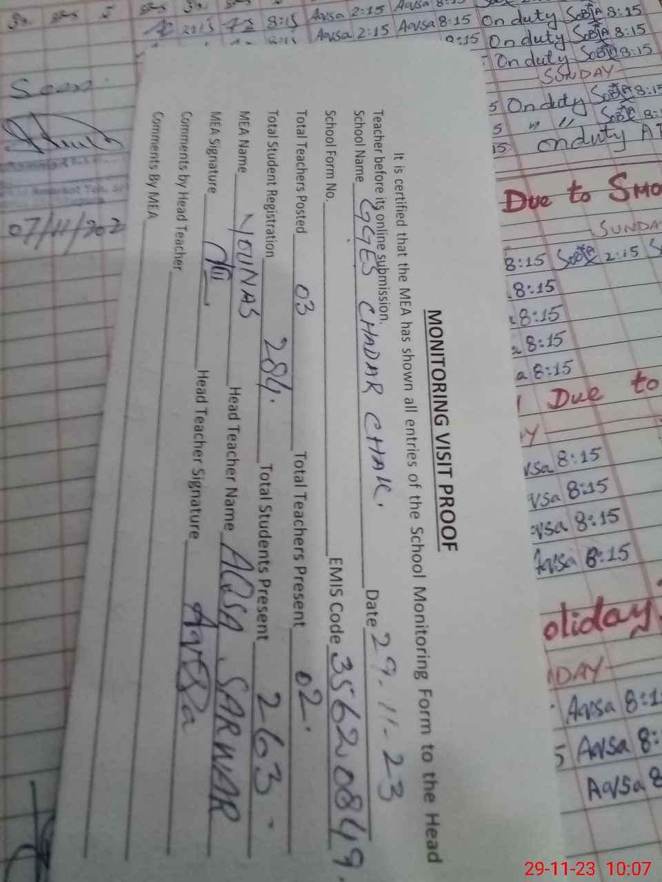 | Attendance Register | Head Teacher | MEA with School | Visit Proof |