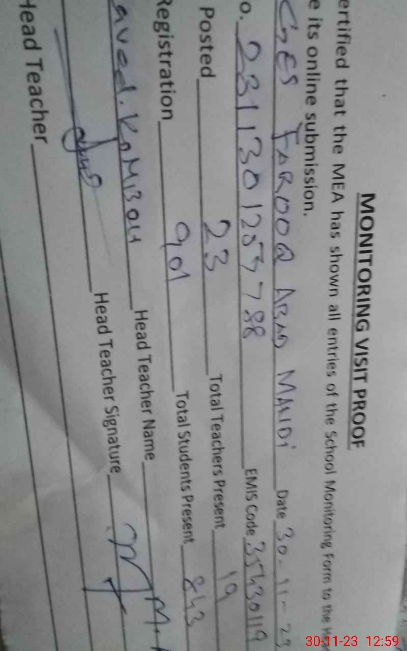 | Name: Mu**** Al**** Designation: (School Headmaster's/Headmistress's) S.S.T.( General ) Phone/Cell Number: 03**** |