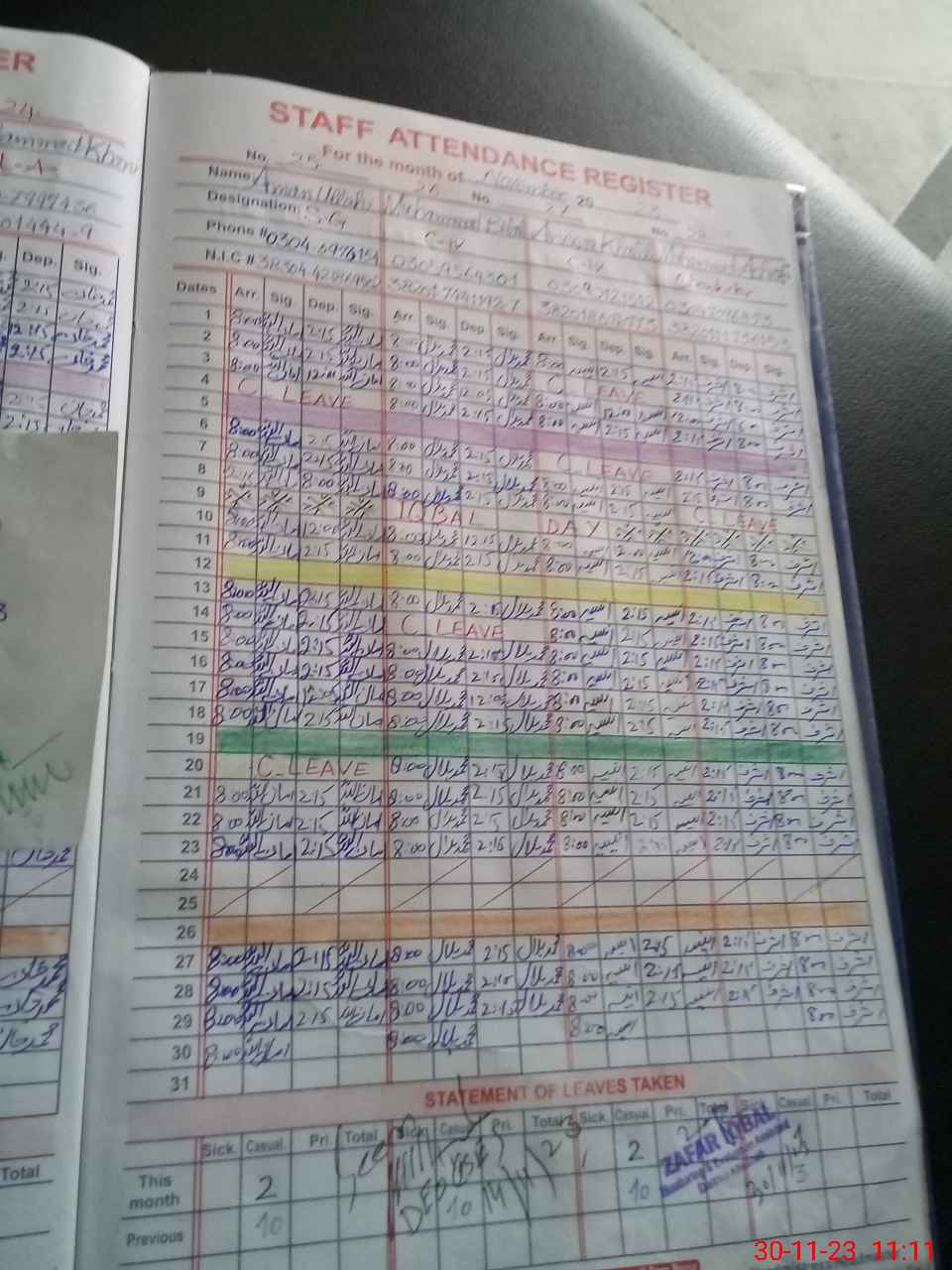 | CNIC | Full Name | Designation | R/C | Absence during last cal. month |