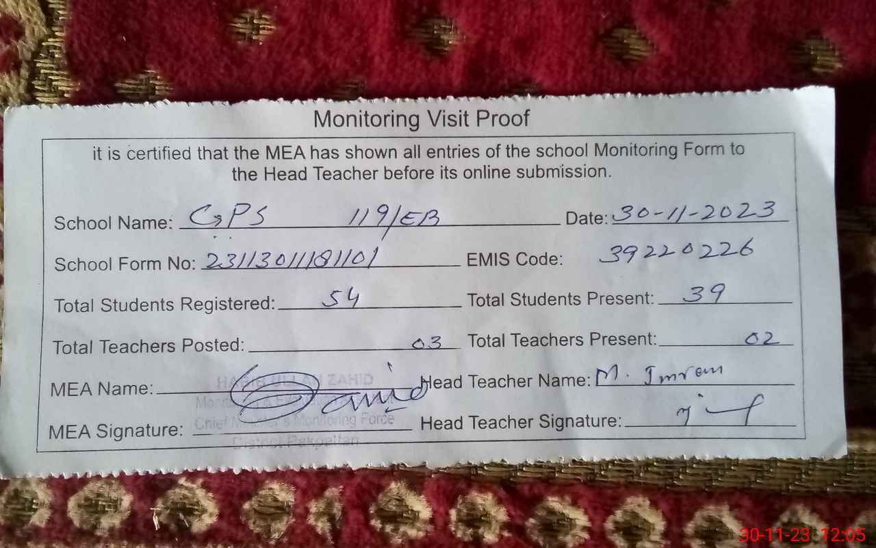| EMIS Code: 39220226 | Name of School: GPS 119 EB ARIF WALA | |||