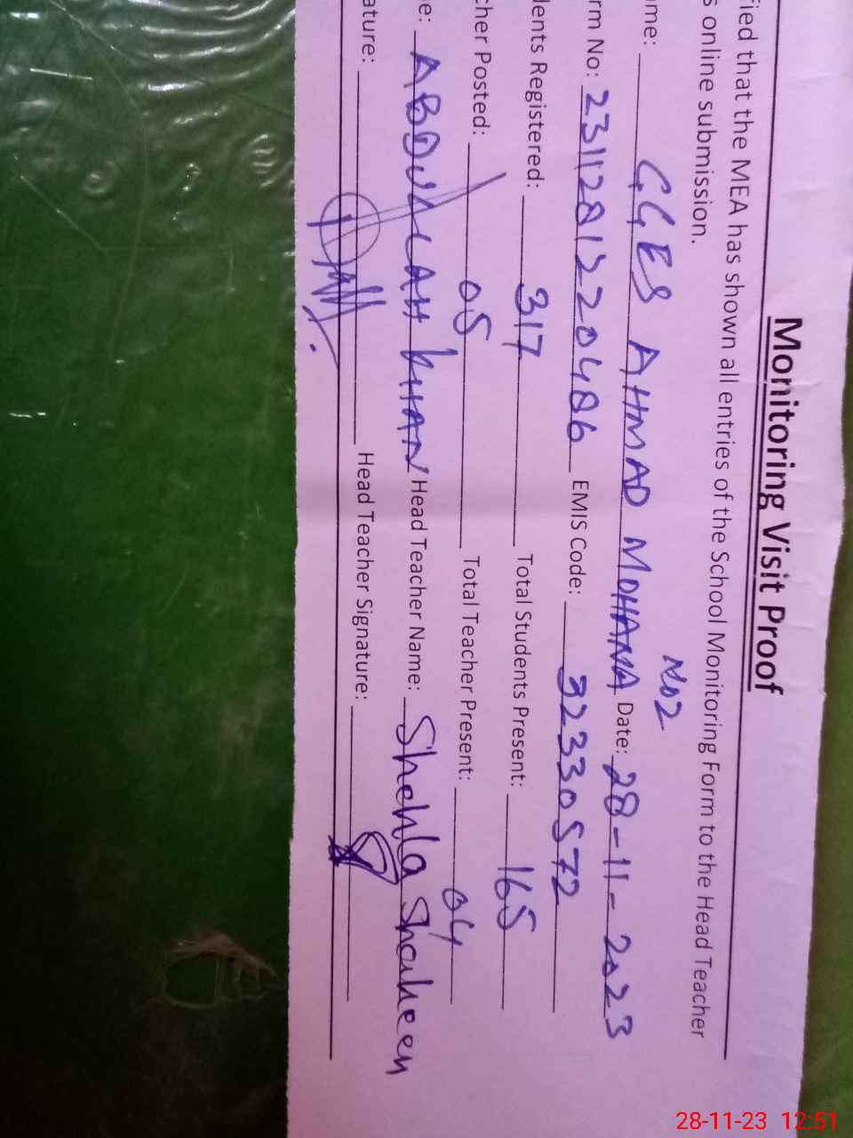 | Attendance Register | Head Teacher | MEA with School | Visit Proof |