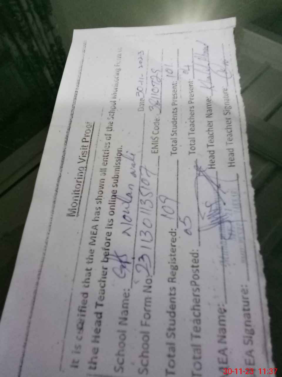 | Attendance Register | Head Teacher | MEA with School | Visit Proof |