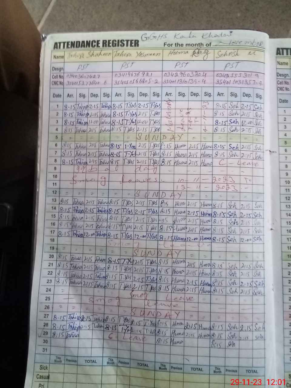 | CNIC | Full Name | Designation | R/C | Absence During Last Calender Month |