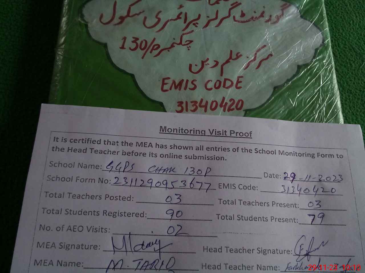 | Attendance Register | Head Teacher | MEA with School | Visit Proof |