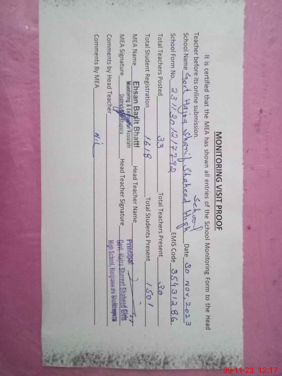 | Attendance Register | Head Teacher | MEA with School | Visit Proof |