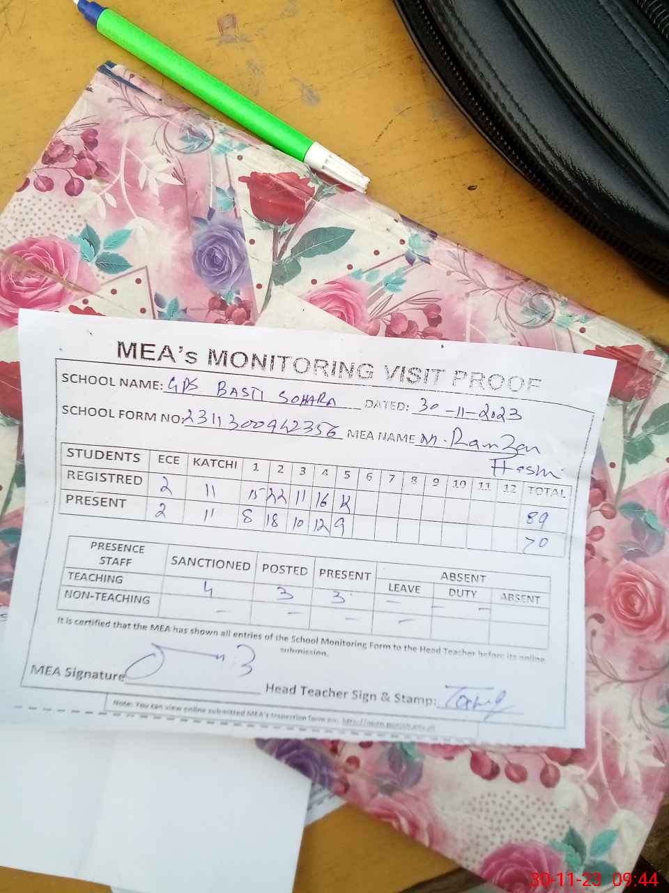 | Attendance Register | Head Teacher | MEA with School | Visit Proof |