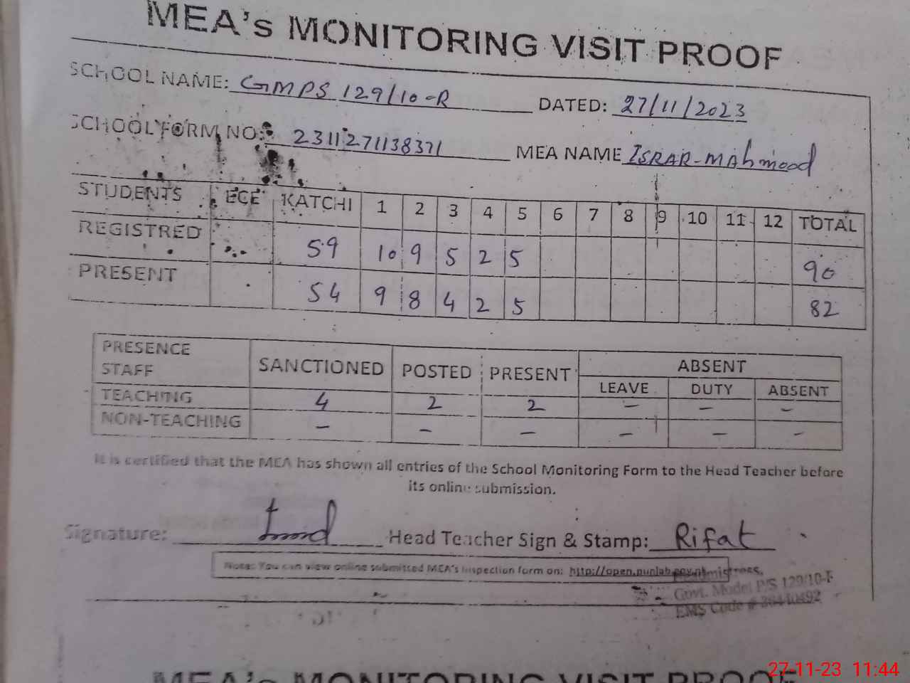 | Attendance Register | Head Teacher | MEA with School | Visit Proof |