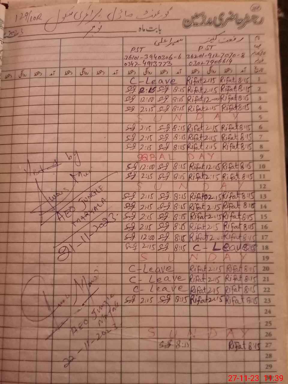 | CNIC | Full Name | Designation | R/C | Absence During Last Calender Month |