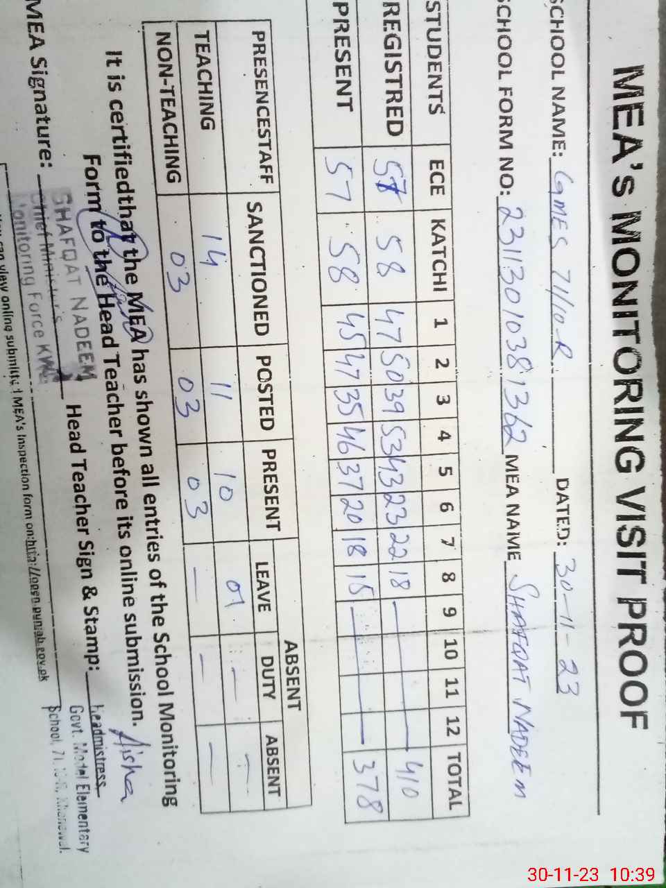 | Attendance Register | Head Teacher | MEA with School | Visit Proof |