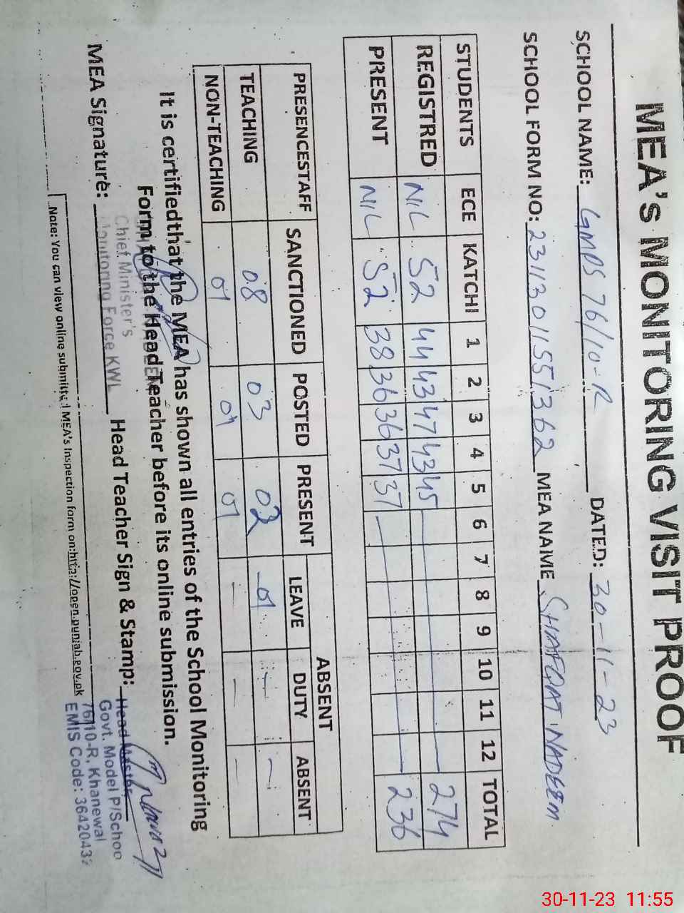 | Attendance Register | Head Teacher | MEA with School | Visit Proof |