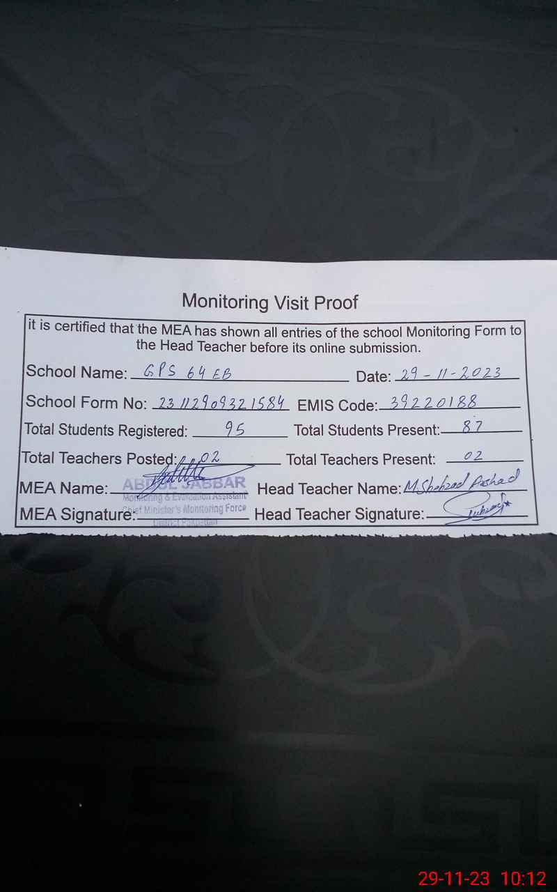 | EMIS Code: 39220188 | Name of School: GPS 64 EB ARIFWALA | |||