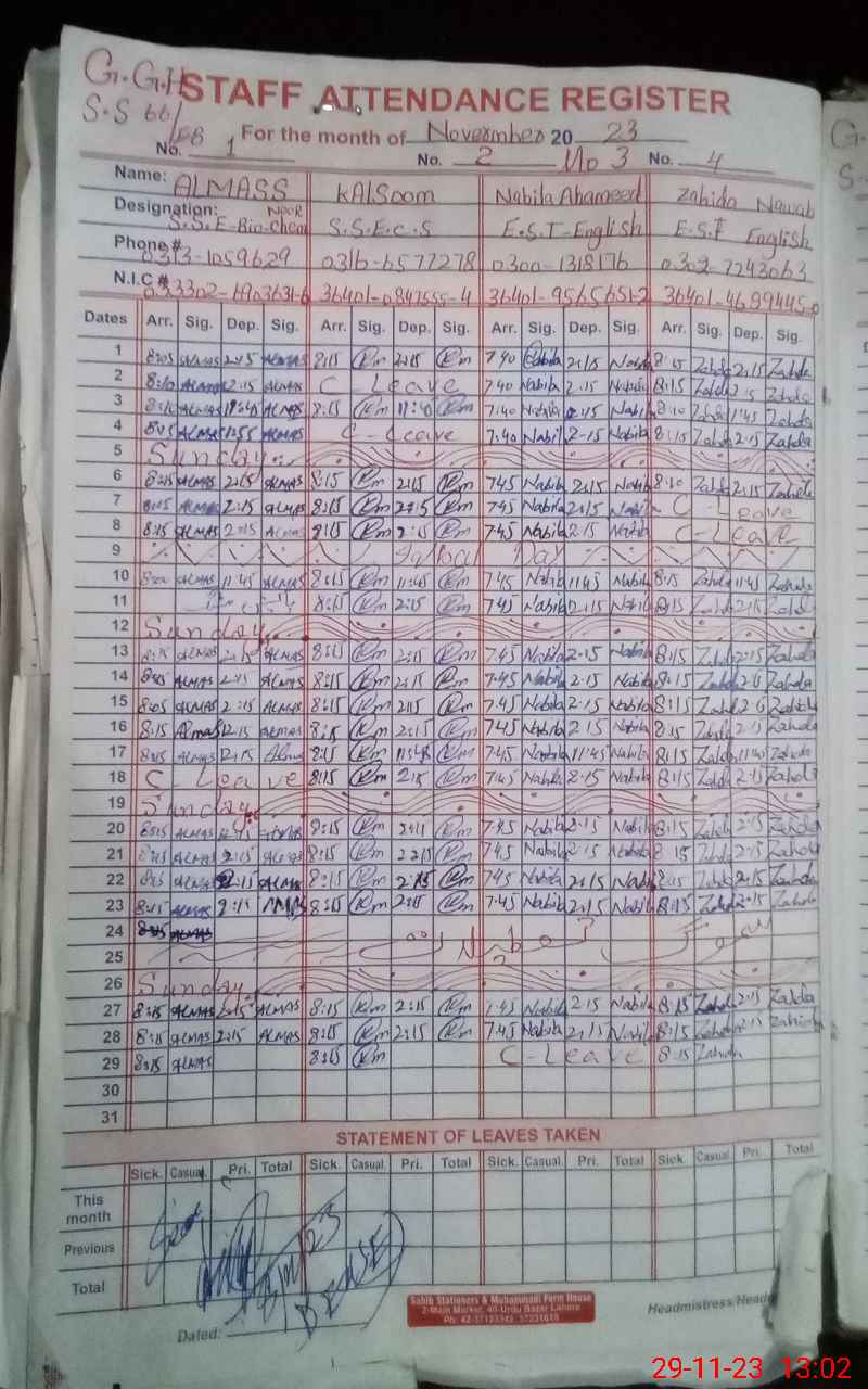| CNIC | Full Name | Designation | R/C | Absence During Last Calender Month |