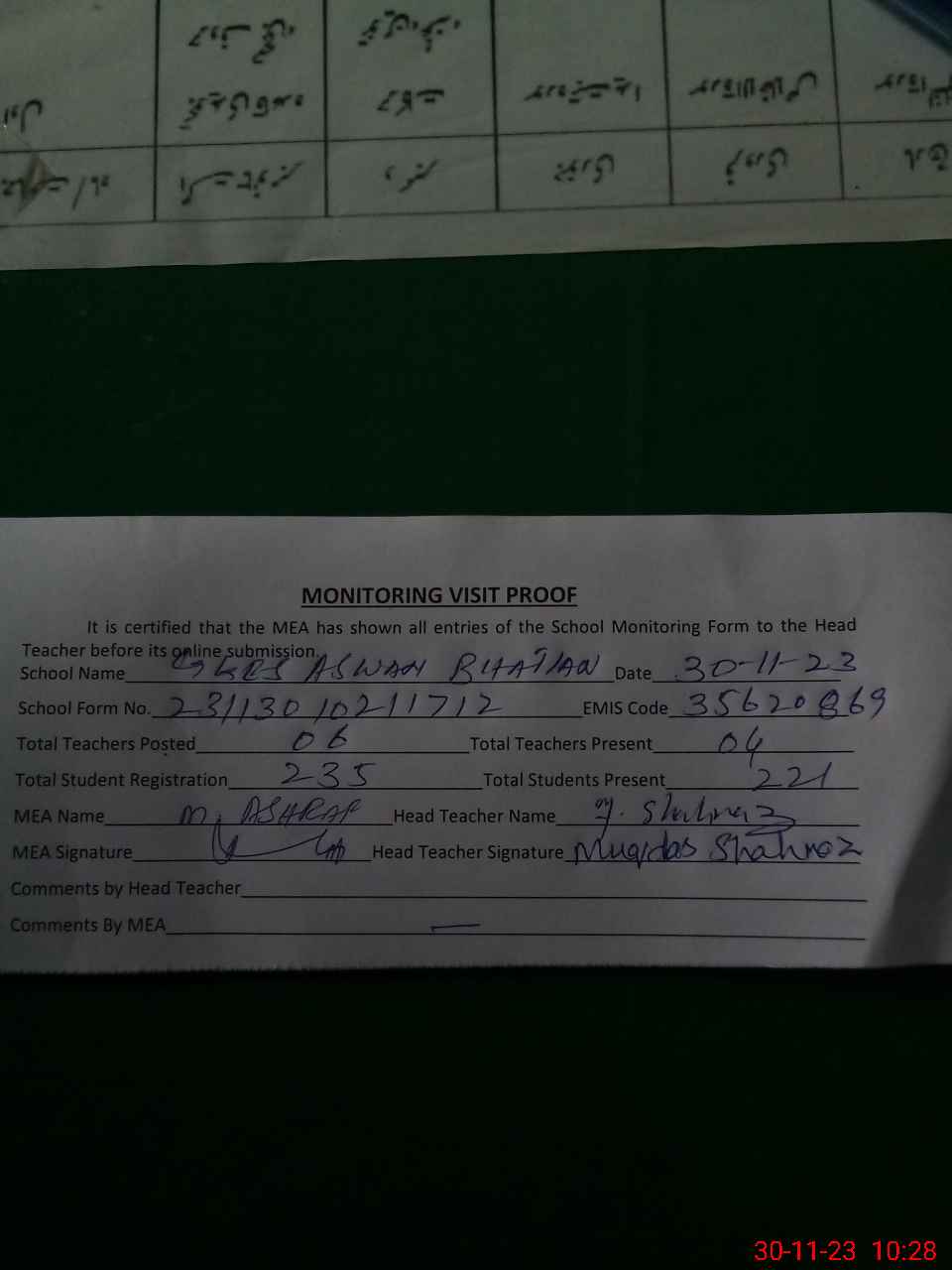 | Attendance Register | Head Teacher | MEA with School | Visit Proof |