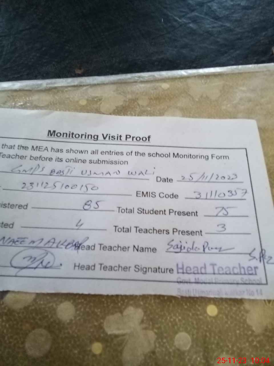 | Attendance Register | Head Teacher | MEA with School | Visit Proof |